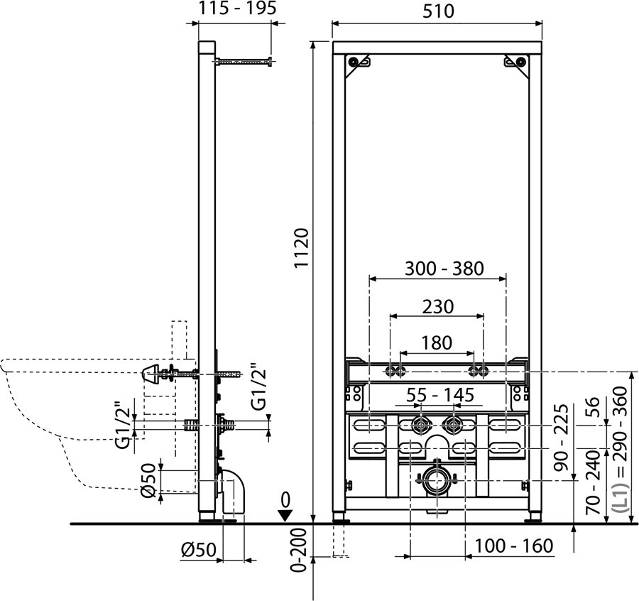 • Rozmery (š/h/v): 510 × 115 – 195 × 1120 mm